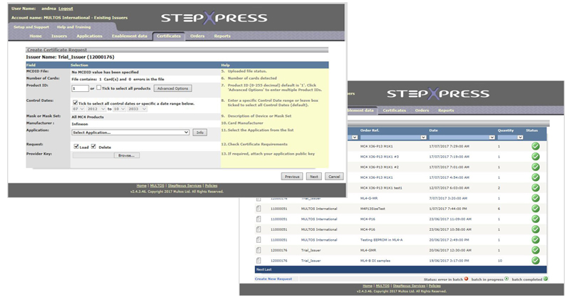 Nuestro servicio on-line StepXpress proporciona soporte para los bureaus de personalización, emisores e integradores de sistemas que utilizan tarjetas MULTOS. Proporcionamos datos de habilitación MULTOS y certificados de carga / remoción de aplicaciones, a través de nuestro sitio que está disponible las 24 horas del día. Ya ayudamos en la emisión de más de mil millones de dispositivos seguros MULTOS.